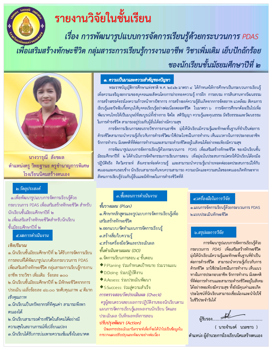 รายงานการจัดการเรียนรู้ด้วยกระบวนการเรียนรู้ที่เน้นทักษะการปฏิบัติงาน เพื่อพัฒนาทักษะชีวิต